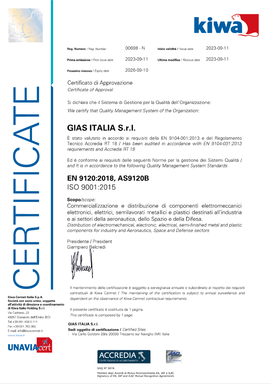 Fermamente convinti che la qualità sia un punto cardine per ogni azienda, abbiamo deciso di affrontare una certificazione di qualità ancora più rigorosa, che specifica i requisiti per i Sistemi di Gestione per la Qualità dei fornitori di prodotti e servizi per i particolari settori di Aeronautica, Spazio e Difesa, la cui normativa di riferimento è la EN 9120.